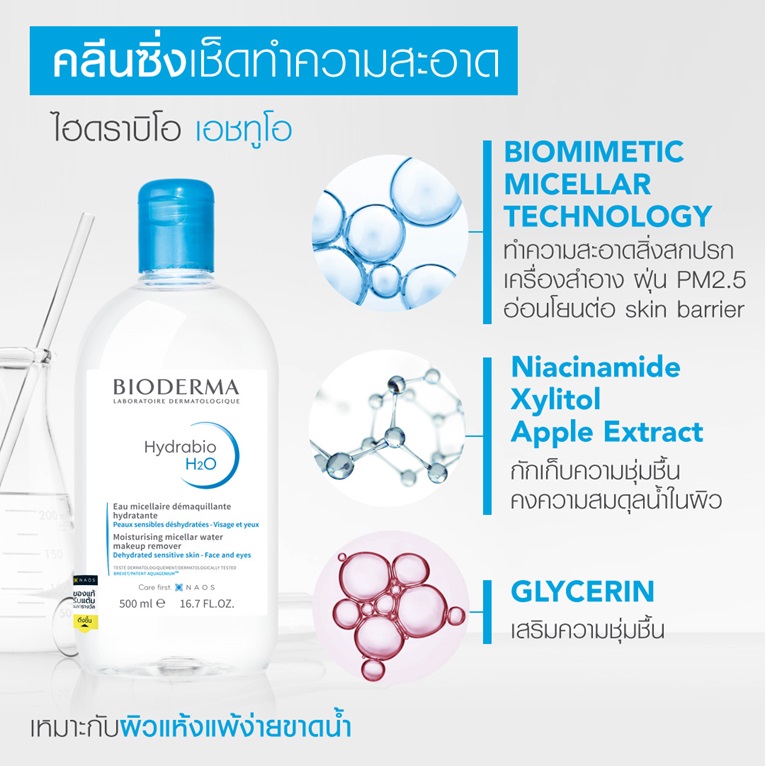 คลีนซิ่งเช็ดทำความสะอาด Bioderma Hydrabio H2O คลีนซิ่งวอเตอร์ที่มีส่วนผสมของกลีเซอรีนและสารสกัดของเมล็ดแอปเปิล ที่มีส่วนช่วยเสริมการทำงานของ Aquaporins ด้วยสิทธิบัตร Aquagenium™ เฉพาะของ Bioderma ช่วยให้ผิวกักเก็บน้ำได้มากขึ้น คงความสมดุลน้ำในผิว เพิ่มความชุ่มชื้นให้แก่ผิวหน้าอย่างยั่งยืน